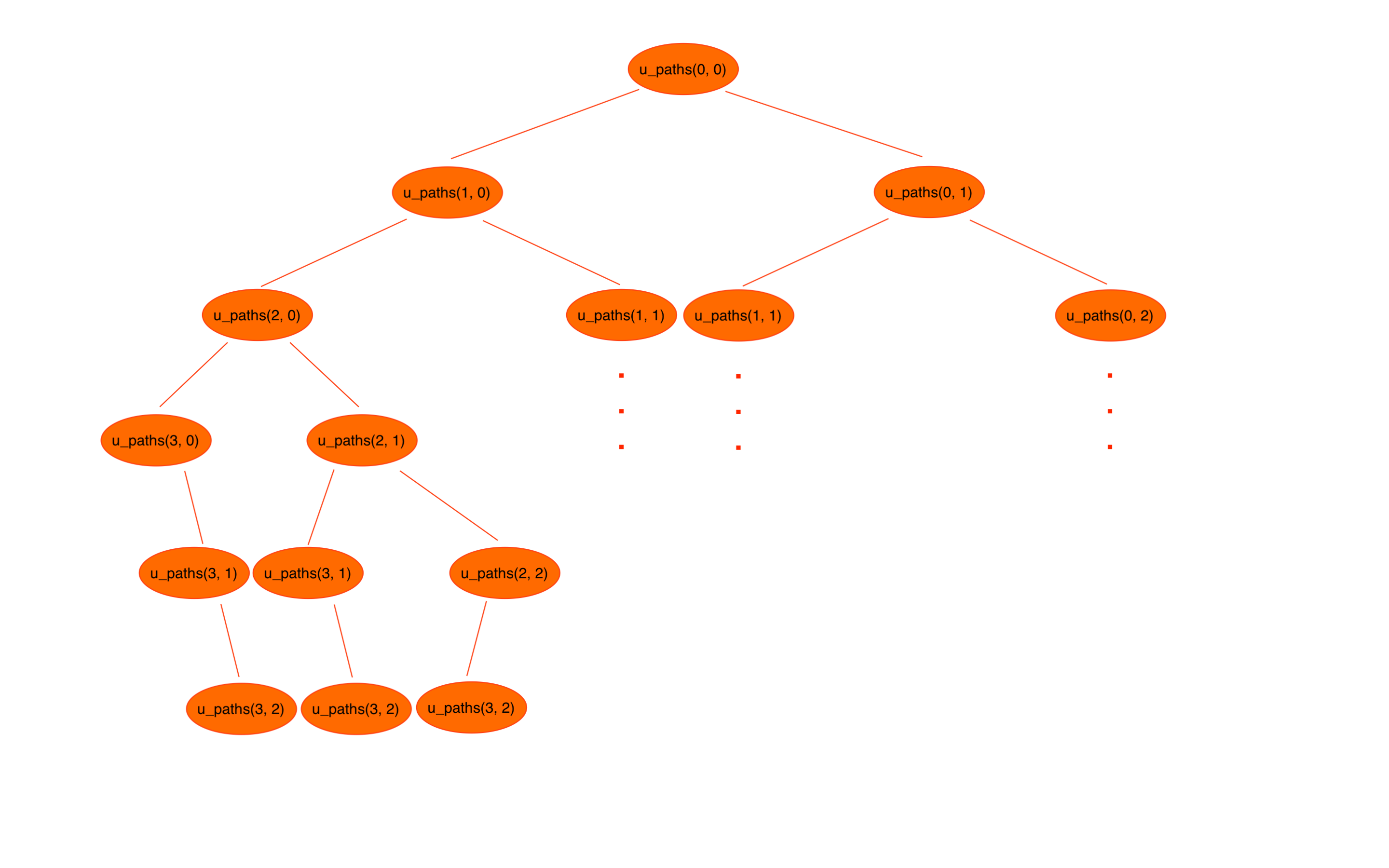 u_paths(0, 0),此時u_paths(i + 1, j)需要呼叫m次才會停,u_paths(i, j + 1)需要呼叫n次才會停,所以總共呼叫m + n次才會停,此時遞迴深度h = m + n